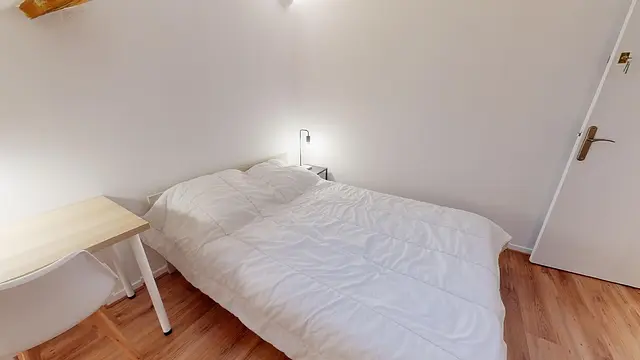L’équipement de la chambre 4 est complet et offre tout le confort nécessaire : lit double, bureau, chaise et rangements.