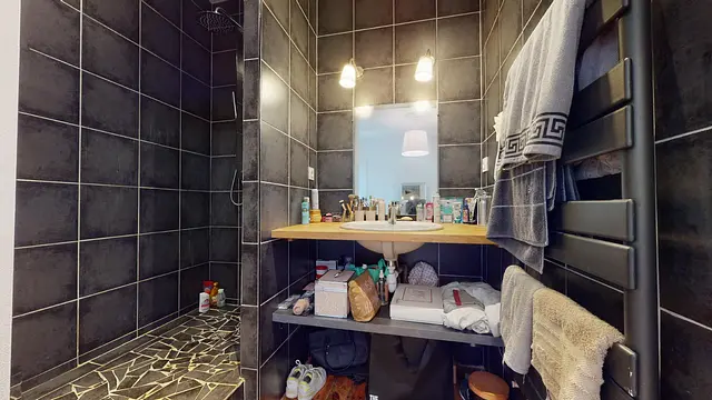 La chambre 2 se compose d'un lit double, de deux tables de chevet accompagnées de lampes, d'un bureau accompagné d'une chaise et d'une lampe, d'une grande armoire de rangement, d'un fauteuil, et d'une salle de bain privative. La salle de bain présente dans la chambre est à l'usage exclusif de son locataire et dispose d'un meuble vasque, d'un sèche-serviette et d'une douche.