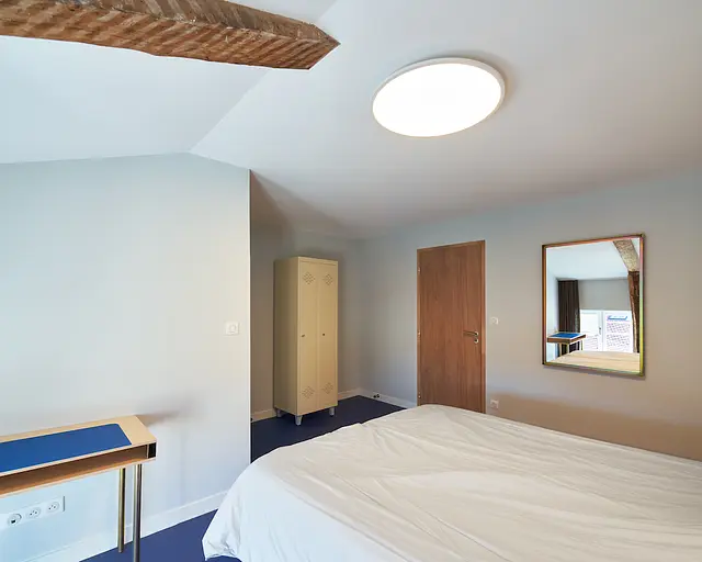 Cependant cette chambre offre un niveau de confort de type hôtelier, salle d’eau et un WC privatif, literie 160x200, bureau, rangements, miroirs.