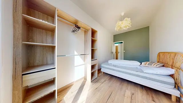 La chambre est équipée d'un lit double, d'un bureau et d'une chaise ainsi que d'une penderie.