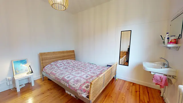 La chambre 2 est équipée d'un lit double, d'une table de nuit, d'un bureau, d'un lavabo et d'un placard.