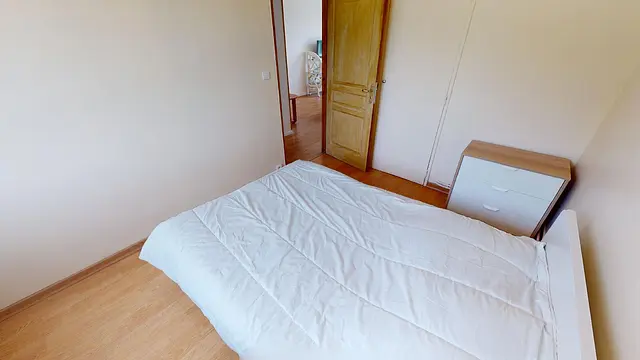 Un grand placard, un petit meuble à chaussures, un bureau et un lit double feront le bonheur du colocataire de cette chambre.