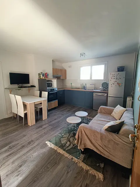 L’appartement se compose d’une grande pièce de vie cumulant une cuisine entièrement équipée ouverte sur le salon. La cuisine offre de nombreux rangements et dispose notamment d’un four, d’un micro-onde, d’un grand frigo et d’un lave-vaisselle. Naturellement, on peut compter sur une table pour manger et un canapé pour chiller ou regarder la télé.