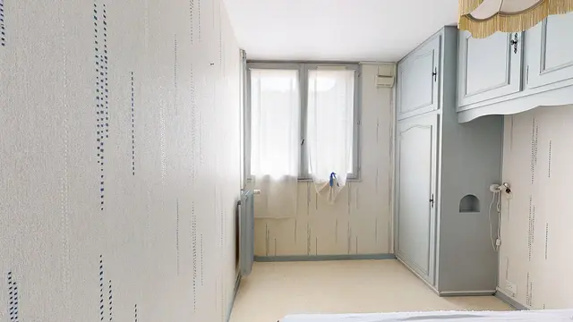 Fonctionnelle et dotée de nombreux placards intégrés, cette chambre comprend un lit simple et une belle capacité de rangement. La grande fenêtre permet de profiter d’une bonne luminosité.