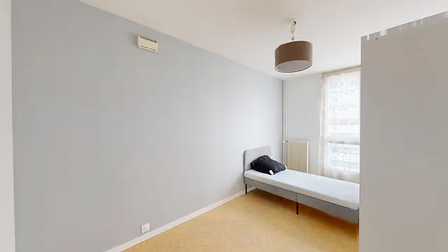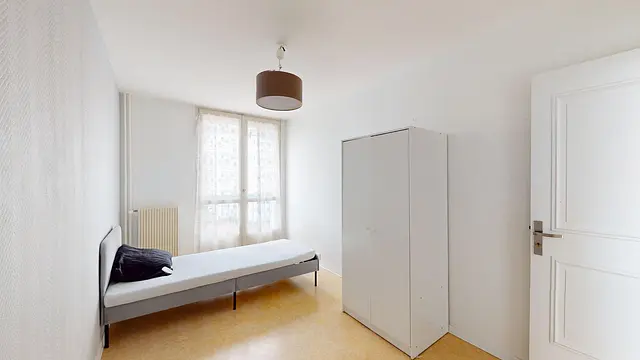 Spacieuse et lumineuse, elle est aménagée avec un lit simple, une armoire de rangement et bénéficie d’une grande fenêtre apportant de la clarté à la pièce.