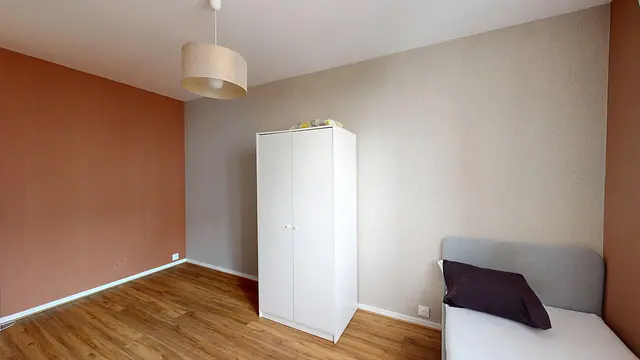 Cette chambre dispose d’un lit simple, d’une armoire de rangement et d’un joli sol en parquet qui apporte une touche chaleureuse. Les murs aux tons modernes, dont un mur coloré, créent une ambiance agréable.