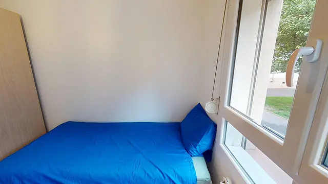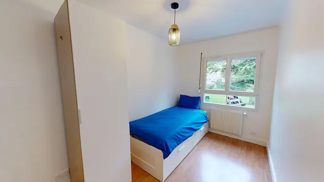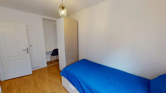 La chambre est équipée d'un lit simple, un placard de rangement et un bureau.