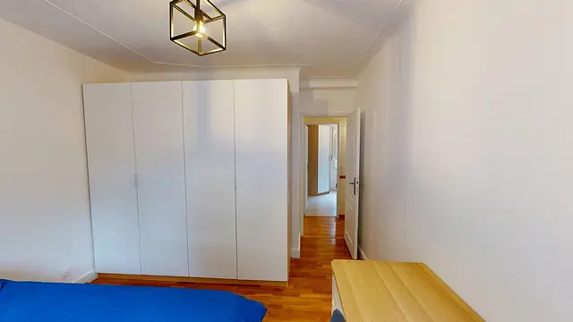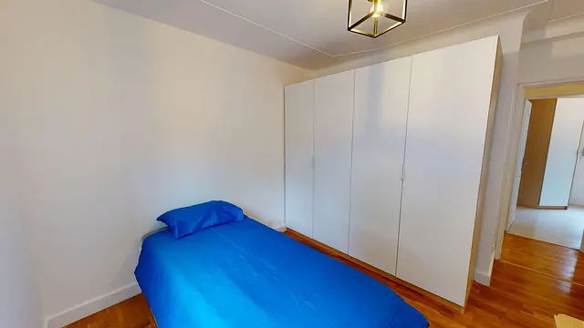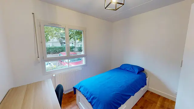 La chambre est équipée d'un lit simple, une armoire et un bureau.