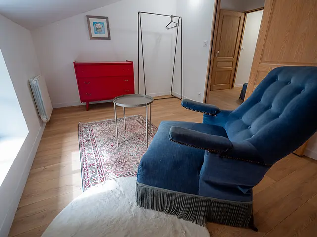 La chambre possède un espace nuit semi-séparé avec lit double, et un salon avec fauteuil et rangements.