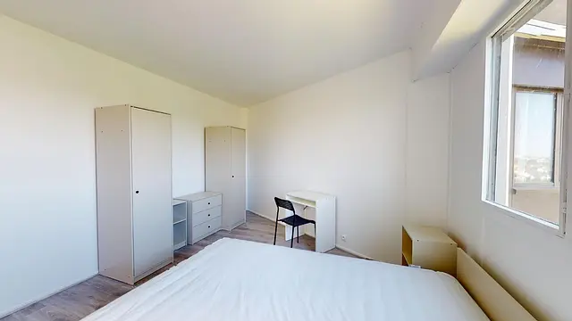 La chambre 1 se compose d'un lit double, d'une table de chevet, d'une commode de rangement, de deux armoires de rangement et d'un bureau accompagné de sa chaise.