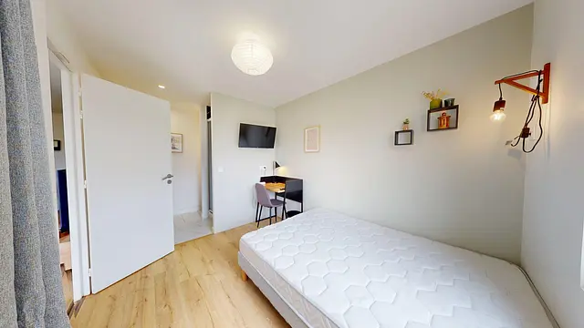 Les chambres sont toutes équipées d’un lit double, d’un bureau, d’une télévision et d’un placard de rangement.