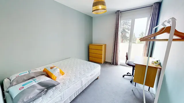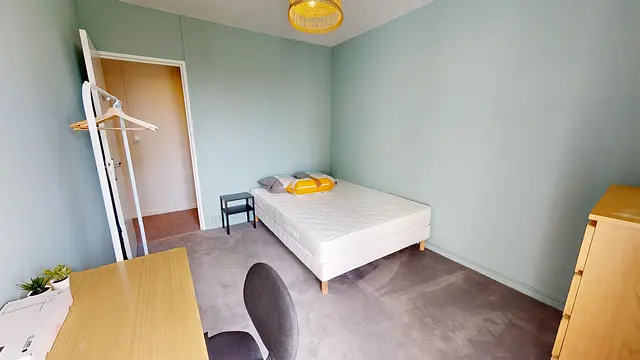 La chambre possède un lit double, bureau et rangements