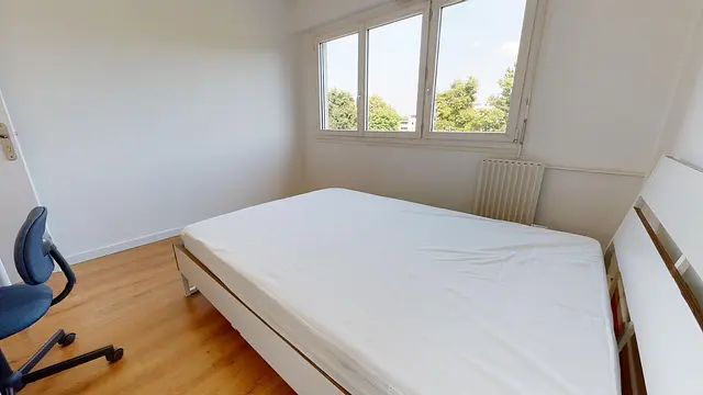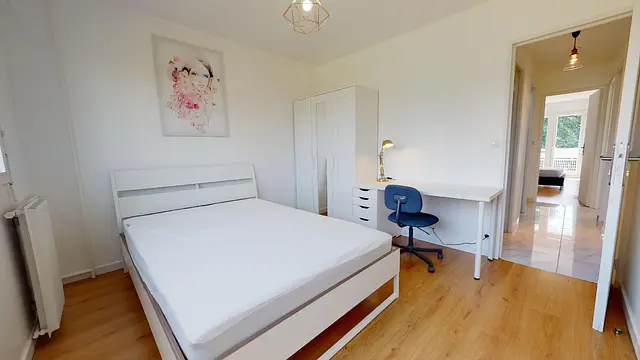 La chambre 3 mesure 11m2 est se situe au fond du couloir sur la droite à proximité des salles de bain. L’équipement de cette chambre est complet : un lit double, un bureau, une chaise et un placard de rangement.