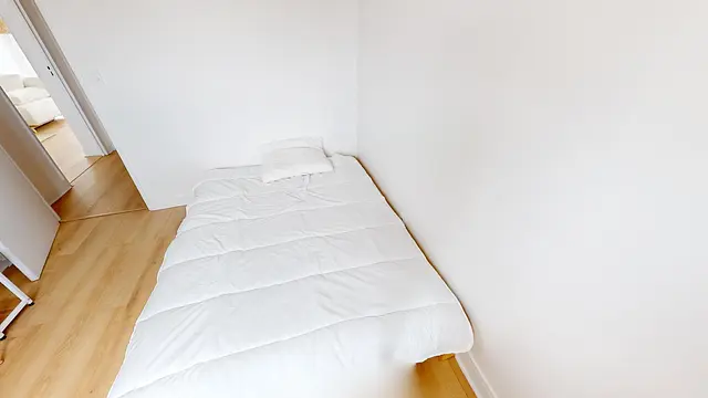 Cet appartement a été entièrement refait à neuf et se compose d’une cuisine ouverte sur une grande pièce de vie, d’une salle de bain, d’un WC indépendant ainsi que de trois chambres similairement agencées avec lit, rangements et bureau.
