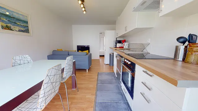 La cuisine ouverte est équipée d'un réfrigérateur avec congélateur, un micro-ondes, un grille-pain, une machine à café, une bouilloire, un évier avec égouttoir, un lave-vaisselle, des plaques de cuisson avec une hotte, un four encastrable et de nombreux rangements. Une table et quatre chaises sont également à disposition, idéal pour partager des repas entre colocataires.