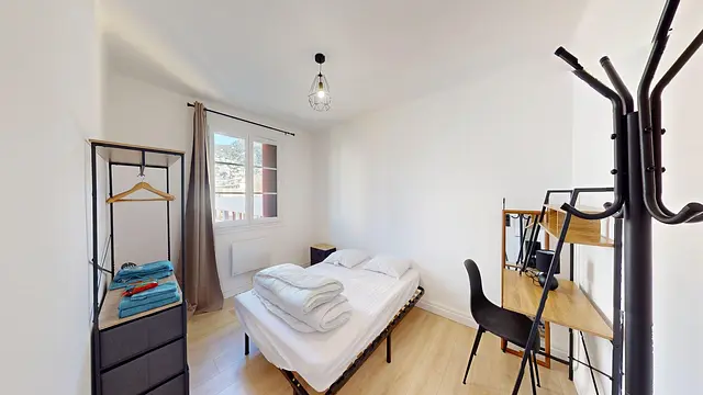 La chambre est équipée d'un lit double, d'un bureau et d'une chaise, d'une table de nuit, d'un meuble penderie et d'un porte-manteau.