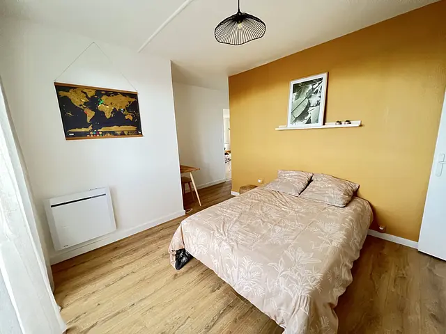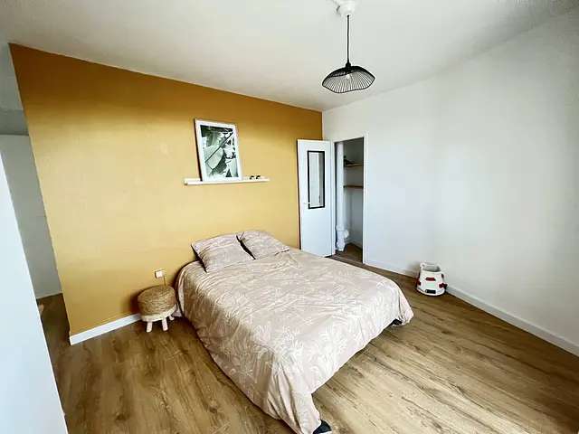 Chambre 3 : équipée d’un lit double, d’un bureau, d’une chaise de bureau, d’une lampe de bureau, d’un placard de rangement et d’une table de chevet. Elle dispose d’une baie vitrée donnant sur le balcon commun avec la chambre 4.
