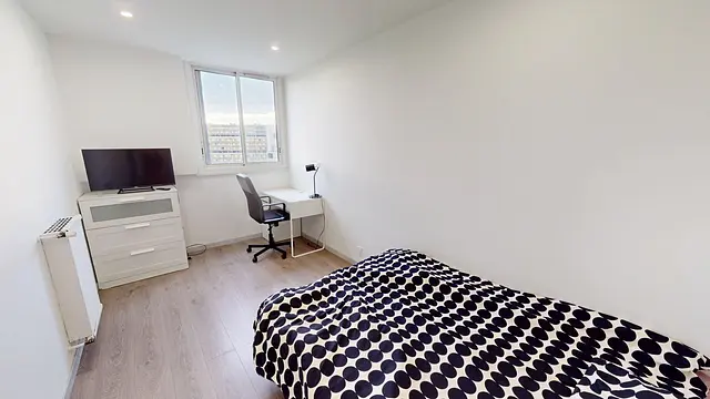 Chaque chambre est équipée d'un lit double, un bureau avec chaise, une lampe de bureau, une table de chevet et une commode.