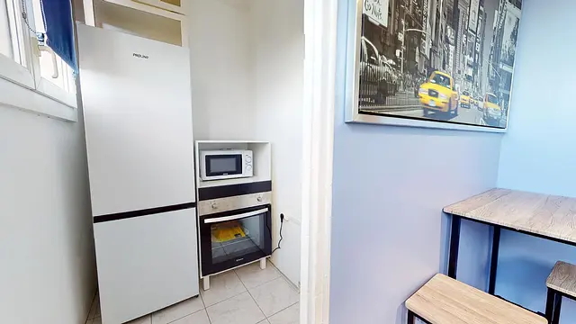 Cette colocation de 4 chambres s'ouvre sur une cuisine équipée d'une machine à laver, des plaques de cuisson, un double évier, une table haute avec deux tabourets, un micro-ondes, un four, un réfrigérateur avec congélateur ainsi que de nombreux rangements.