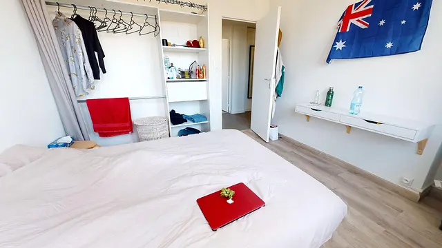 La chambre 1 de 11m2 est située sur la gauche de l’entrée. Cette chambre comporte un lit double, un bureau, une chaise ainsi que plusieurs rangements : étagères, penderie et placard intégré.