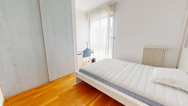 Elle est équipée d'un lit (double), bureau, et placard de rangement.
