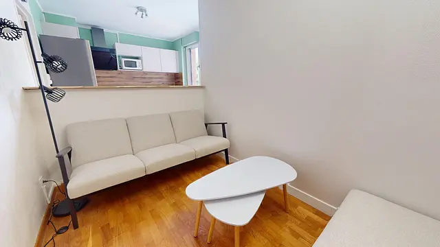 Le salon donne sur la cuisine par une ouverture dans le mur, il est aménagé avec un canapé ainsi qu'un fauteuil, deux tables basses gigognes, une télévision écran plat et son meuble TV. L’espace est parfait pour se détendre.