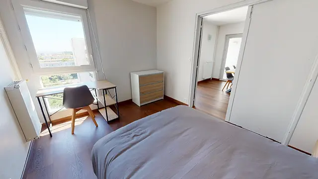Cette chambre de 11m2 possède un lit double, un bureau ainsi qu'un grand placard de rangement