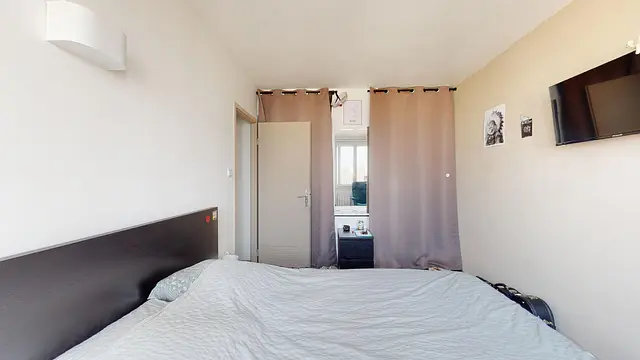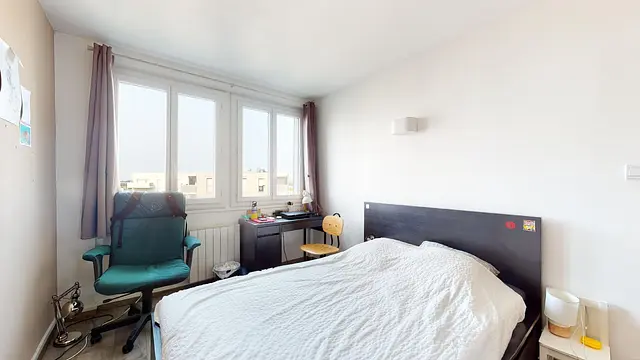 La chambre 2 se compose d'un lit double, d'une TV murale, d'un grand meuble dressing, d'un bureau accompagné d'une chaise, d'une table de chevet accompagné d'une lampe .