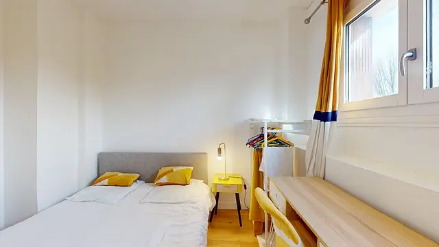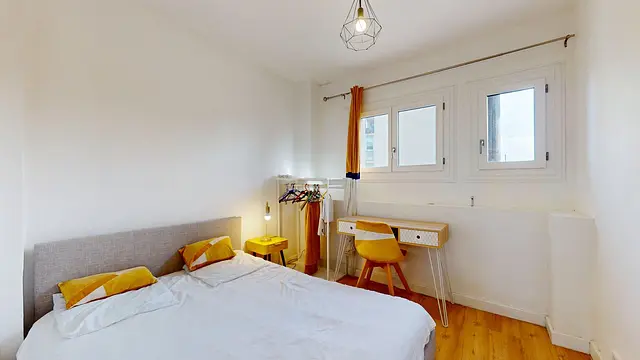La chambre 1 est équipée d’un lit double, d’un bureau avec chaise, d’une penderie, d’une table de chevet et d’une lampe de chevet. Elle bénéficie d’un balcon commun avec la chambre 2, offrant un espace extérieur supplémentaire.