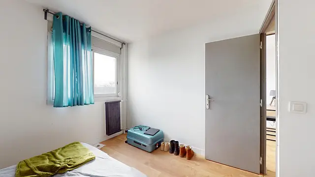 Cette colocation de trois chambres s'ouvre sur une entrée avec un meuble à chaussures et un porte-manteau. Le séjour est aménagé d'un canapé, d'une table basse et d'un meuble TV avec une télévision.