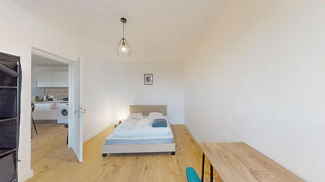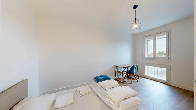 Oqoro vous propose cette chambre. Elle est composée d'un lit double, d'un bureau avec une chaise et d'une table de chevet. Également, vous disposez de rangement.