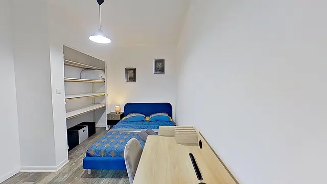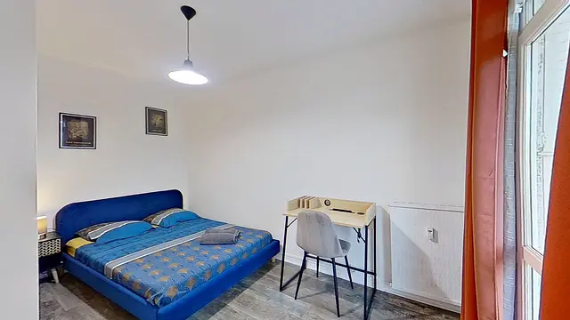 Cette chambre dispose d’un bureau, d’une fenêtre et surtout d’un grand placard intégré au mur, offrant davantage d’espace de rangement ainsi qu'une penderie.