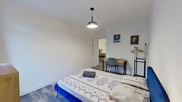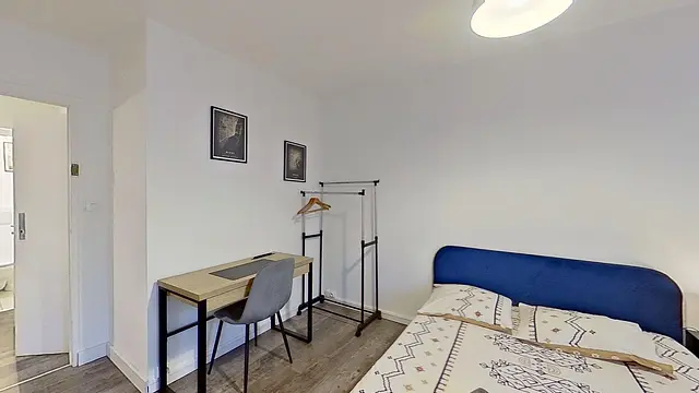 Cette chalbre bénéficie d’une grande fenêtre qui apporte une belle luminosité. Elle est aménagée avec un bureau, un portant pour vêtements et un meuble de rangement.