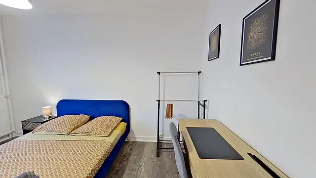 Cette chambre est équipée d’un bureau, d’un portant et d’un meuble de rangement, avec une large fenêtre qui laisse entrer la lumière naturelle.