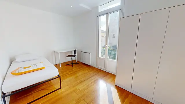 Cette chambre dispose d'un lit simple, d'une armoire et d'un bureau avec une chaise. Cette chambre dispose d'un balcon privatif.
