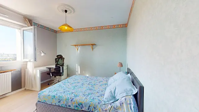 La chambre est spacieuse et lumineuse. Elle est entièrement meublée et équipée pour votre confort : lit double, bureau, armoire et table de chevet.
