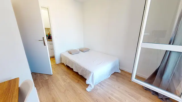 La chambre 4 de 10m2 est la seule chambre offrant un accès direct au balcon en commun avec la pièce de vie. Cette chambre se compose d’un lit double, d’un bureau, d’une chaise et d’un placard de rangement intégré.