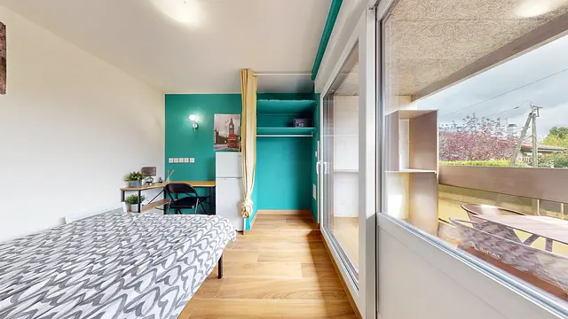 Cette chambre dispose d'un grand lit double idéalement placé face à une jolie baie vitrée, offrant un accès direct au balcon et laissant entrer une belle luminosité naturelle. Elle propose un cadre de vie fonctionnel grâce à son bureau d'angle dédié au travail et à ses équipements privés, incluant un réfrigérateur ainsi qu'un coffre-fort intégré dans l'espace de rangement.