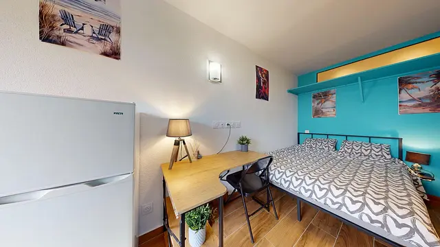Cette chambre dispose d'un grand lit double idéalement placé face à une jolie baie vitrée, offrant un accès direct au balcon et laissant entrer une belle luminosité naturelle. Elle propose un cadre de vie fonctionnel grâce à son bureau d'angle dédié au travail et à ses équipements privés, incluant un réfrigérateur ainsi qu'un coffre-fort intégré dans l'espace de rangement.