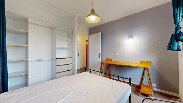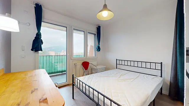 L’appartement se compose de deux chambres meublées, chacune équipée d’un lit double, d’un bureau, d’une chaise et d’une penderie. Elles disposent également d’un accès direct à un balcon partagé offrant une vue dégagée sur le Salève et une belle exposition plein sud, sans vis-à-vis.
