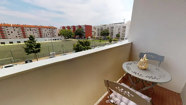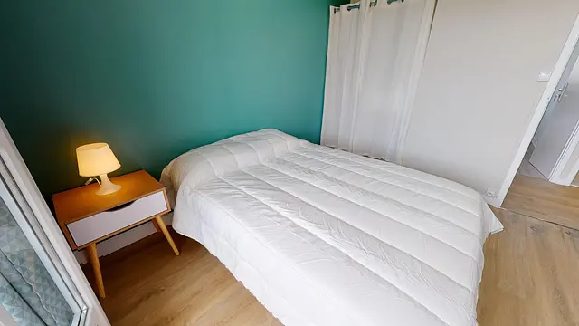 La chambre 2 également accessible depuis le salon mesure 11m2. Elle est équipée d’un lit double, d’un bureau, d’une chaise et d’un placard intégré. Le plus : la chambre offre un accès direct à un balcon privatif avec table et chaise !