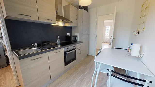 Cette colocation comporte une cuisine moderne équipée d’un four, d’un micro-ondes, de plaques de cuisson, d’une hotte, de rangements, d’une table à manger, etc.