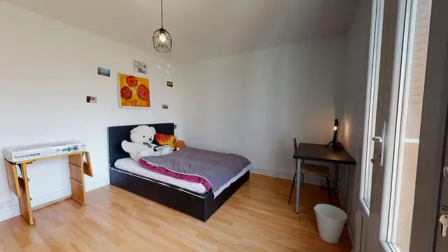 La chambre 3 la plus grande de cette colocation mesure 15m2. Cette chambre est équipée d’un lit double, d’un bureau, d’une chaise et d’un placard de rangement.