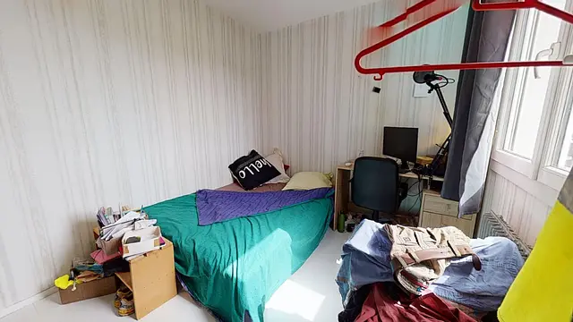 La chambre 2 est totalement équipée et aménagée et offre tout le confort nécessaire : un lit double, un bureau, une chaise et un grand placard.