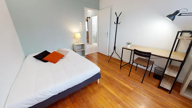 La chambre 3 de 11,5m2 est située à droite de l’entrée. Cette chambre est aménagée avec un lit double, un bureau, une chaise et un placard de rangement.