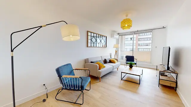 Le salon est lumineux, et se compose d’un canapé, d’une table basse, de deux fauteuils, de deux lampadaires, d’un meuble TV et d’une TV.