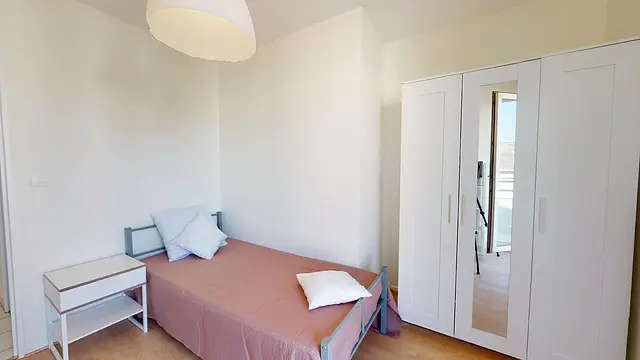 La chambre 4, située au bout du couloir, partage un balcon avec la chambre 5. D’une surface de 9m², elle possède un lit simple, un meuble cases, un grand placard avec porte miroir et espace penderie et un bureau.