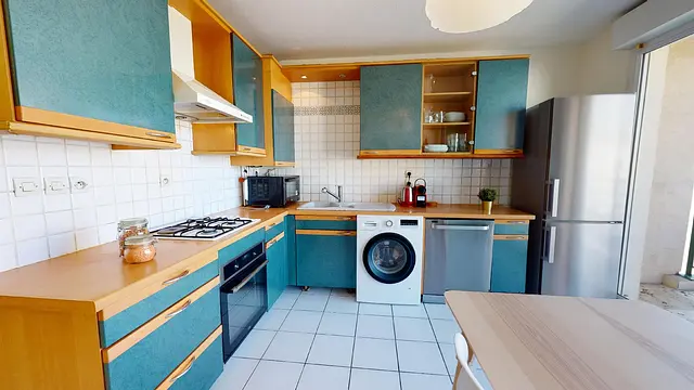 La cuisine, lumineuse, dispose notamment d’une machine à laver et d’un lave-vaisselle en plus de l’électroménager obligatoire en location meublée (four, frigo, plaques de cuisson). Son balcon accueille une petite table idéale pour discuter entre colocs.