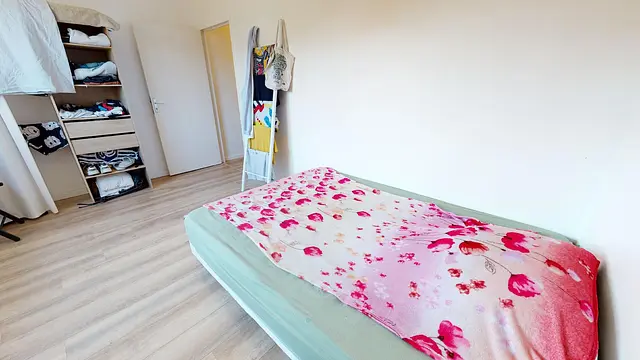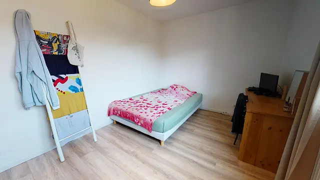La chambre 1 de 12m2 est la plus grande de cette colocation. Elle se compose d’un lit double, d’un bureau, d’une chaise et d’un placard de rangement.