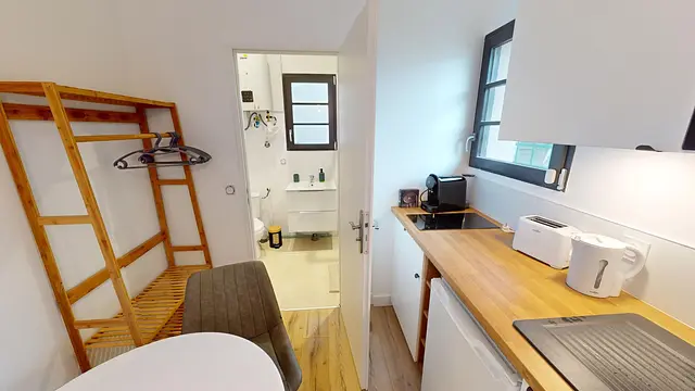 Le studio se compose d’un coin rangement, d’un espace nuit, d’une cuisine entièrement équipée, ainsi que d’une salle de bain.